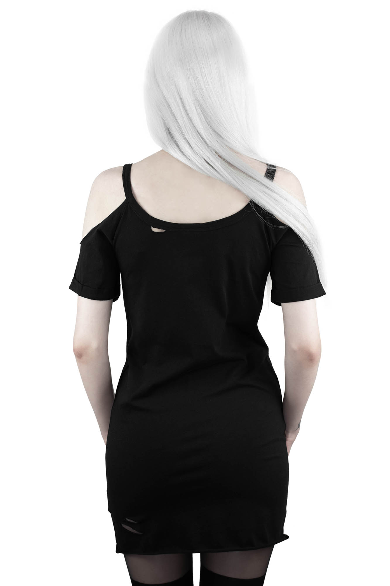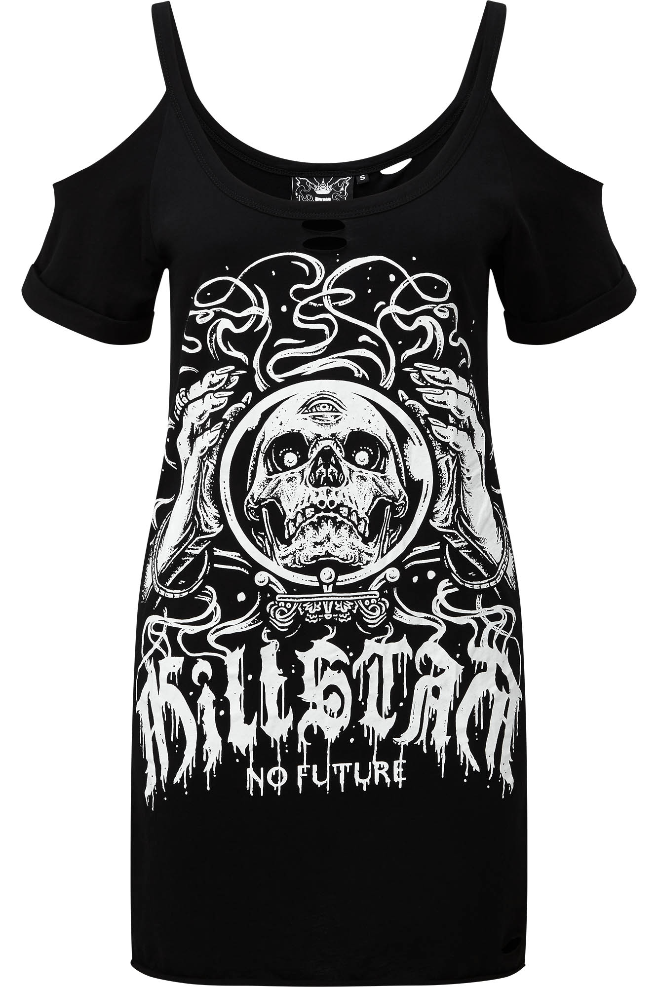 Be wild and have fun - channel the mischievous side of yer soul in this distressed top in soft-touch cotton jersey, raw edge and distress cut-detail, and cold shoulder statement. Large graphic print on chest. An ideal day-to-day piece to inject some infernal feelz.