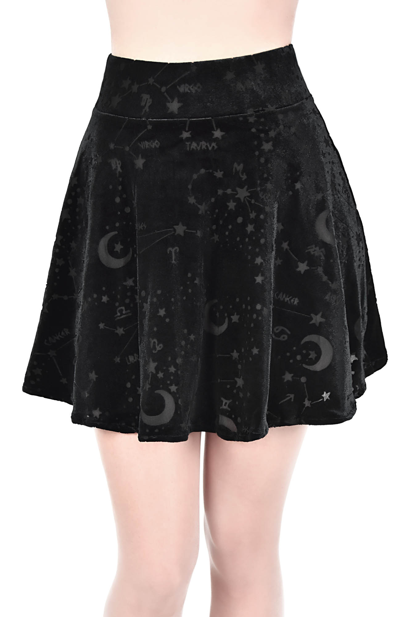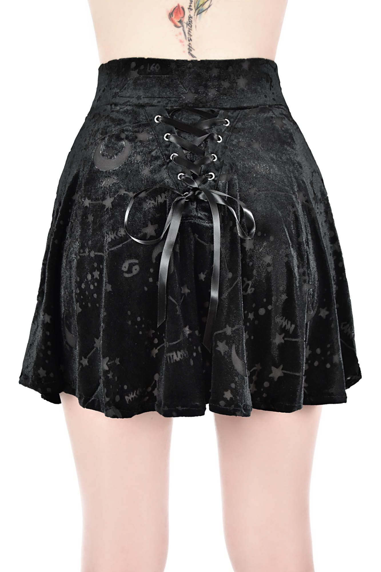At the darkest time of night, stars will shine the most bright. Evoke the mysteries of the occult; the romantic 'Cordelia' mini skirt is conjured from the softest stretch-velvet; with a cosmic constellation burnout-pattern. With wide elastic waistband, extra flare body and statement lace-up back. Perfect for date night, coven meetups or simply a day/night out the crypt!